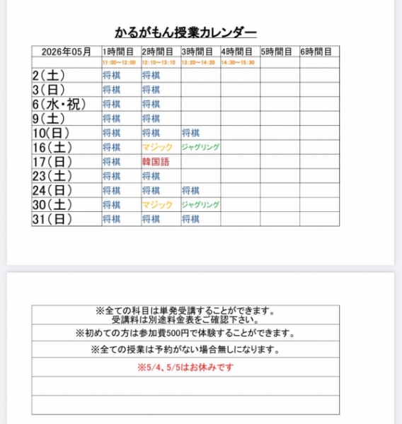 かるがもん / お好み居酒屋 まごみ 2026.5授業予定カレンダー